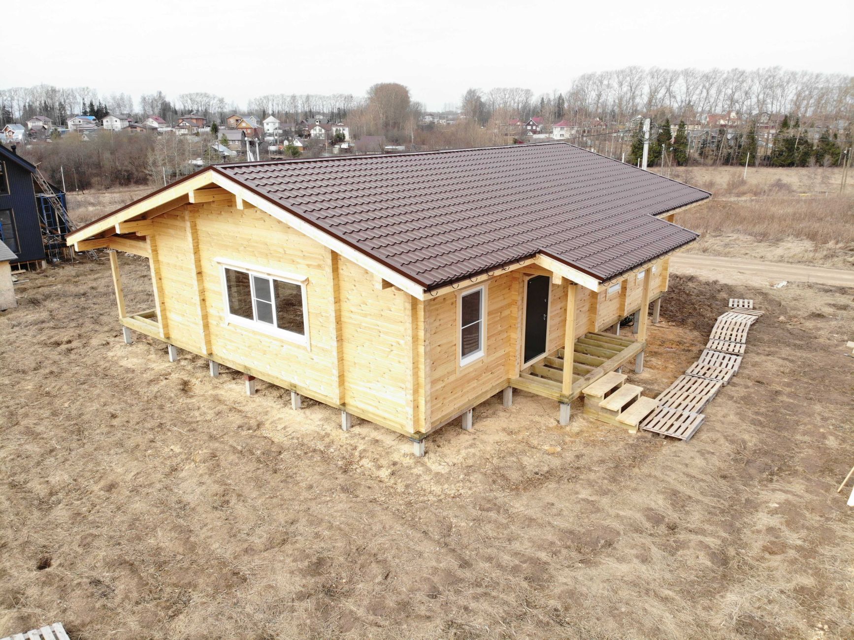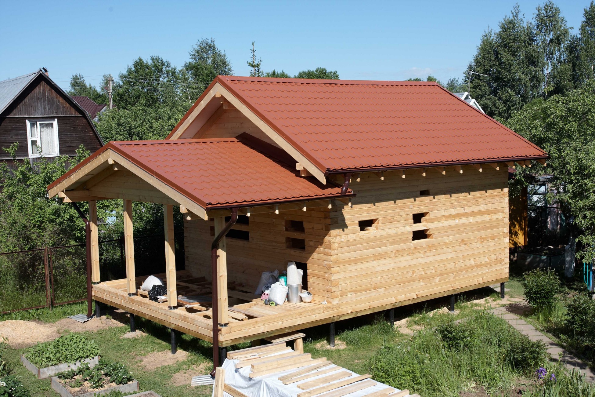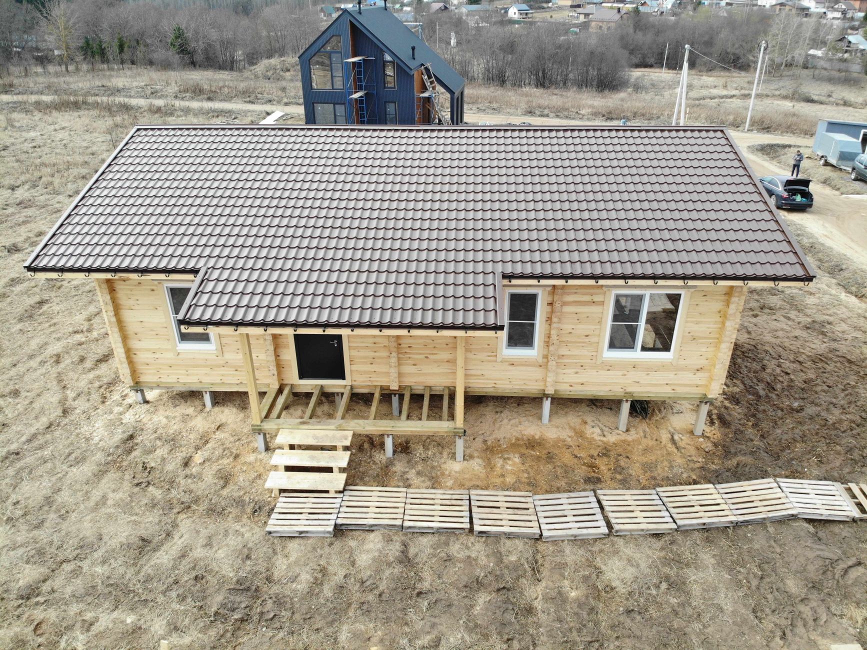 Сборку сруба мы завершили 9 апреля 2021 года, крышу покрыли металлочерепицей «каскад», которую в народе называют «шоколадной плиткой».