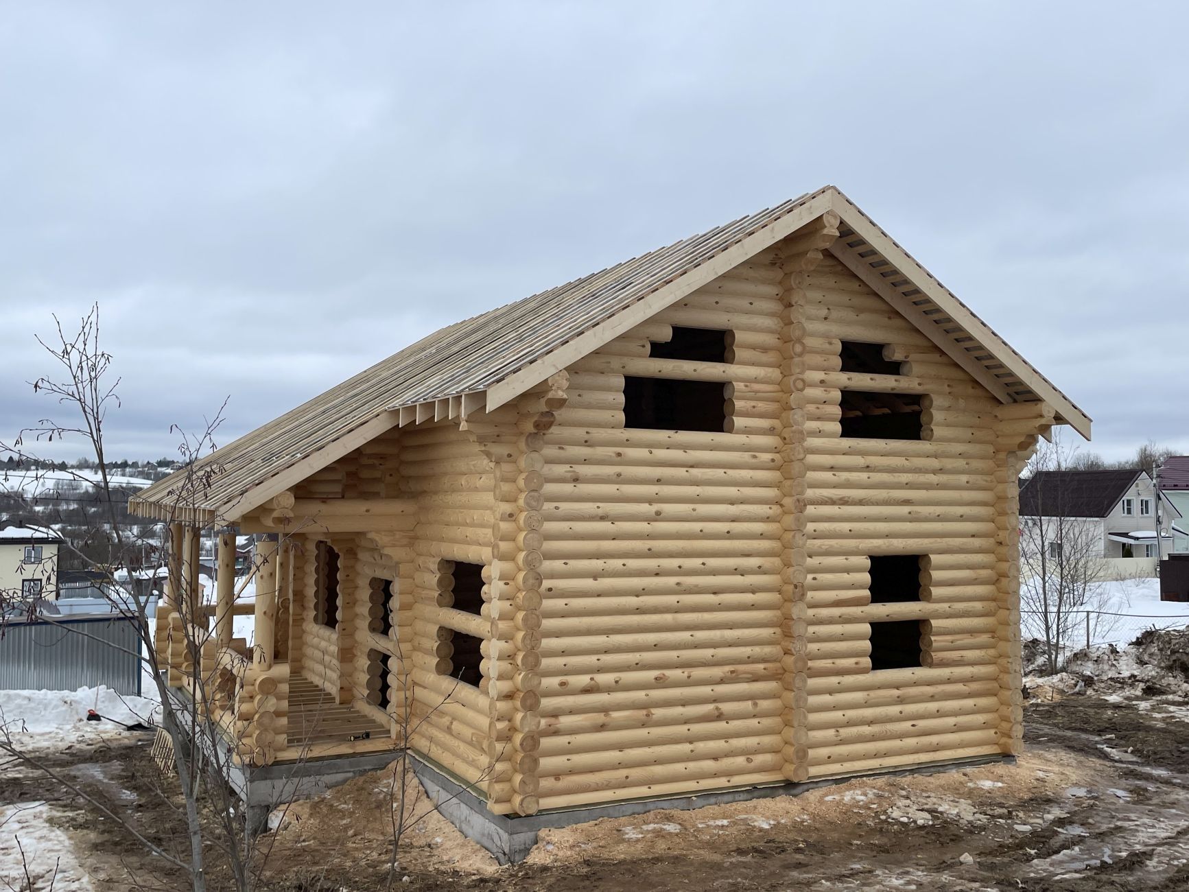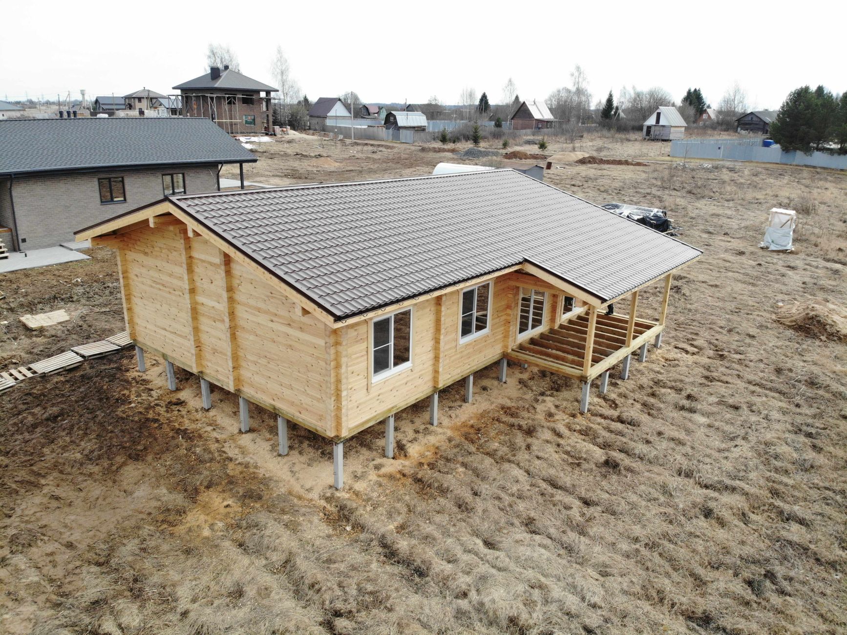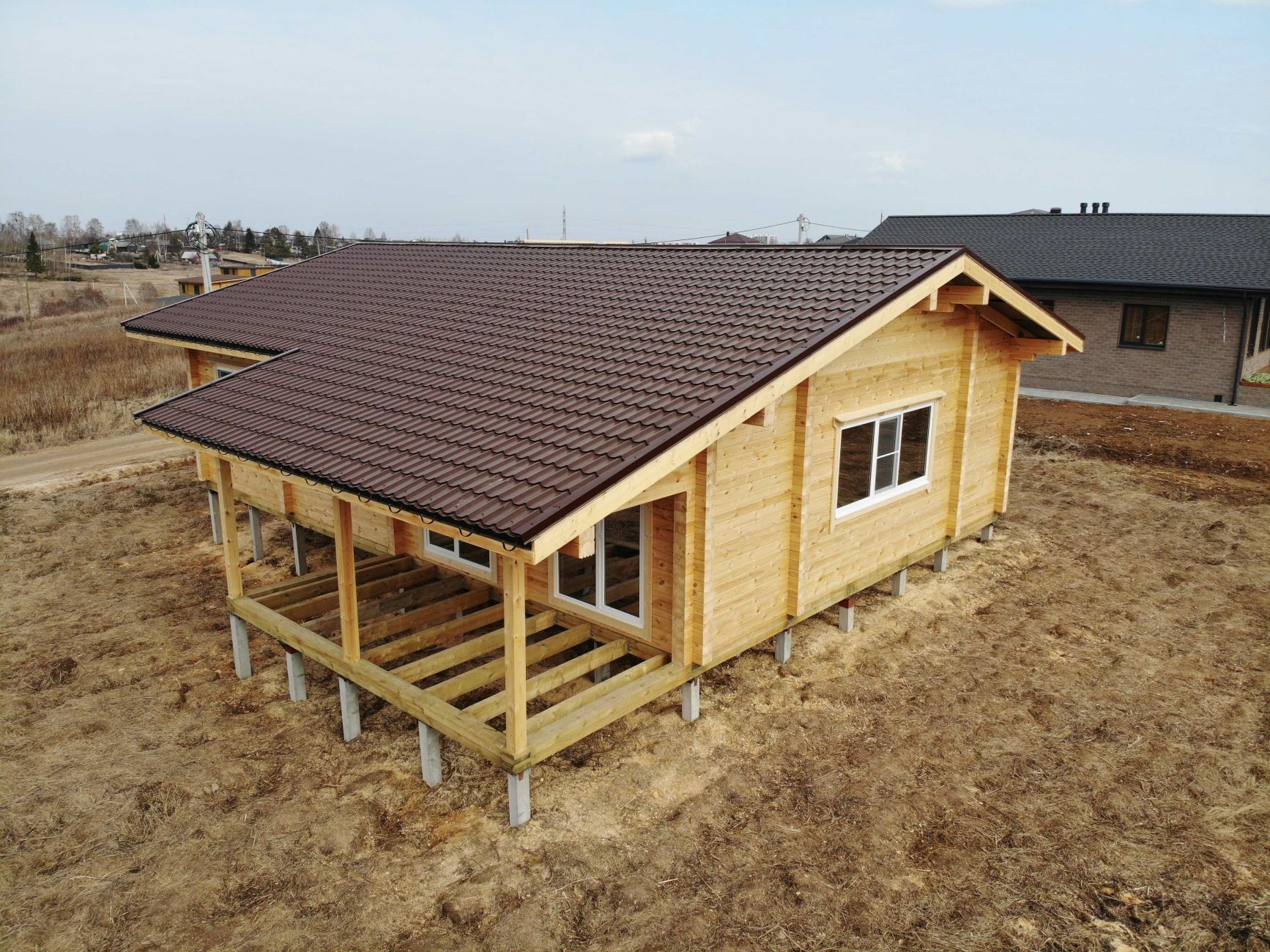 Сборку сруба мы завершили 9 апреля 2021 года, крышу покрыли металлочерепицей «каскад», которую в народе называют «шоколадной плиткой».