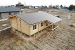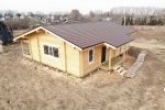 Фундамент заказчик залил самостоятельно, выбрав мелкозаглубленную ленту. Как только раствор набрал нужную прочность, мы привезли готовый домокомплект и приступили к сборке. Весь процесс занял 2 недели, включая покрытие крыши металлочерепицей и установку обсадных коробок на проемы.