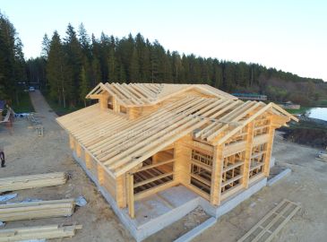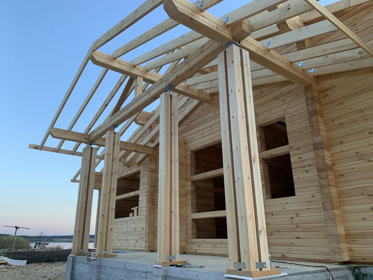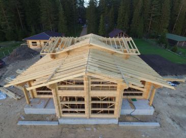 На объекте трудилась бригада Артёма Бешеля. Гараж оказался не слишком сложным для сборки – на нём коллеги, по сути, разминались. А вот на строительстве дома пришлось попотеть! Ещё бы! Площадь дома–265 м²! Многоскатная крыша 367 м² на двух уровнях! Четырехстоечные столбы, массивные стропила из бруса, многочисленные узоры на выносах! В общем, чтобы воплотить все задумки архитектора, ребятам потребовалось 2 месяца. Считаем, справились они на славу! Артём, Женя и Паша – вы огромные молодцы! Спасибо за труды!
