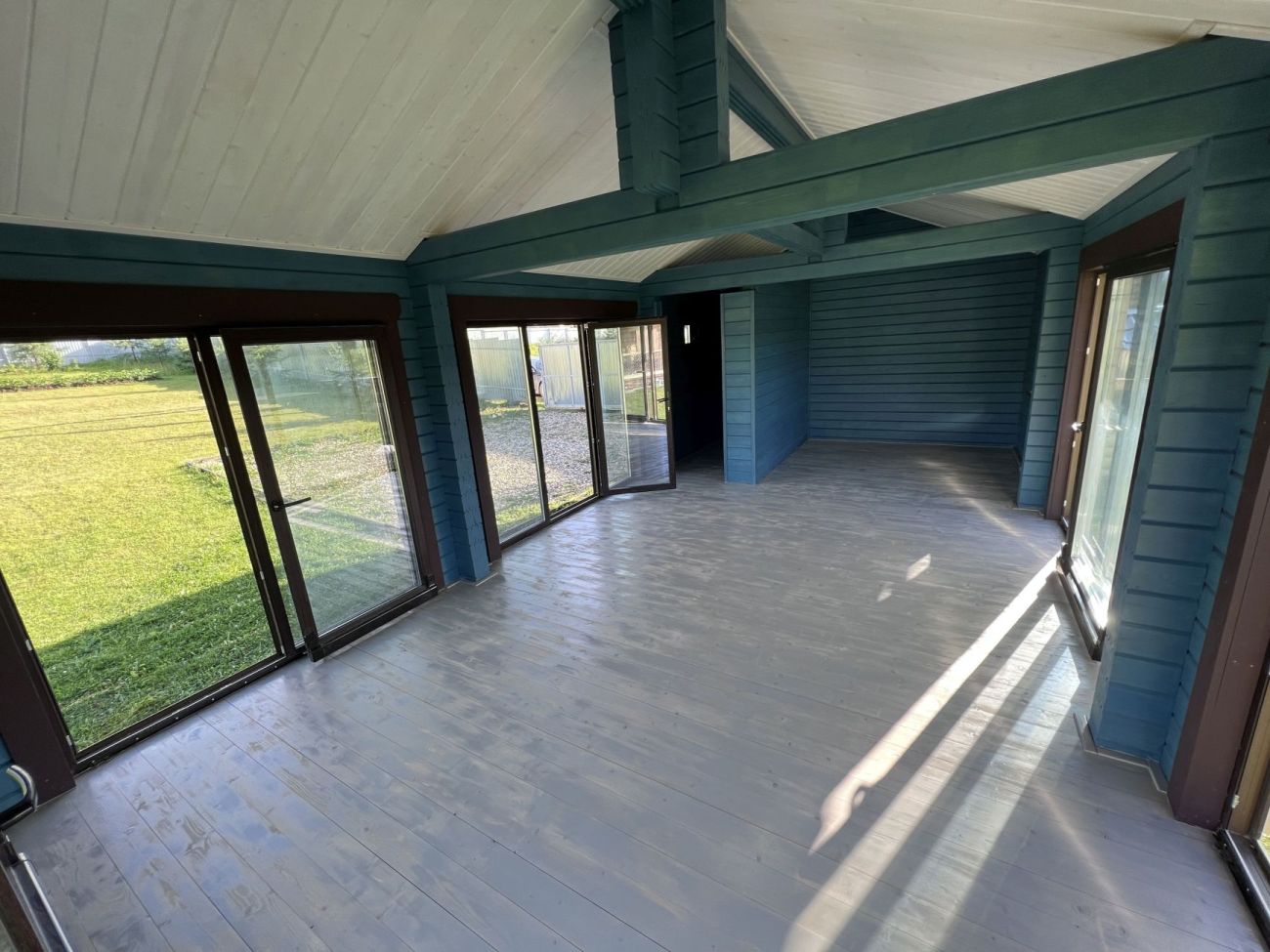 Продолжаем строительство беседки из профилированного бруса 140х140мм в деревне Терпелка Вологодского района. В декабре прошлого года установили домокомплект на свайный фундамент. В июле приступили к отделочным работам. Какие работы уже выполнили?