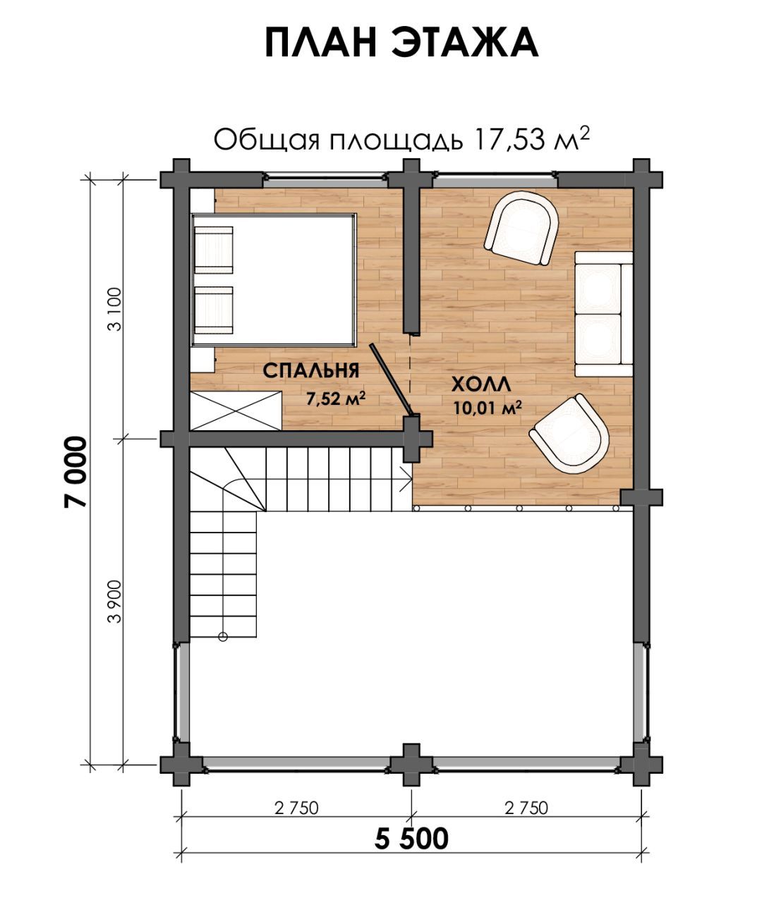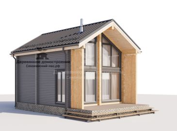 Бревенчатый коттедж площадью в 67 м2 можно порекомендовать как дачу, небольшую загородную резиденцию, глэмпинг. Кухня-гостиная (17 м2) наполнена светом и воздухом благодаря перекрытиям по скатам крыши и огромным окнам. В качестве жилых помещений специалисты предлагают использовать две спальни по 7,2 м2, расположенные на первом и втором уровнях постройки.