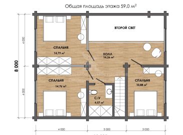 На 2-м этаже находятся холл (14,26 м²), санузел (4,57 м²) и три спальни (14,79 м², 14,76 м² и 10,88 м² соответственно). Изюминка 2-го этажа – балкон и второй свет в зоне гостиной.