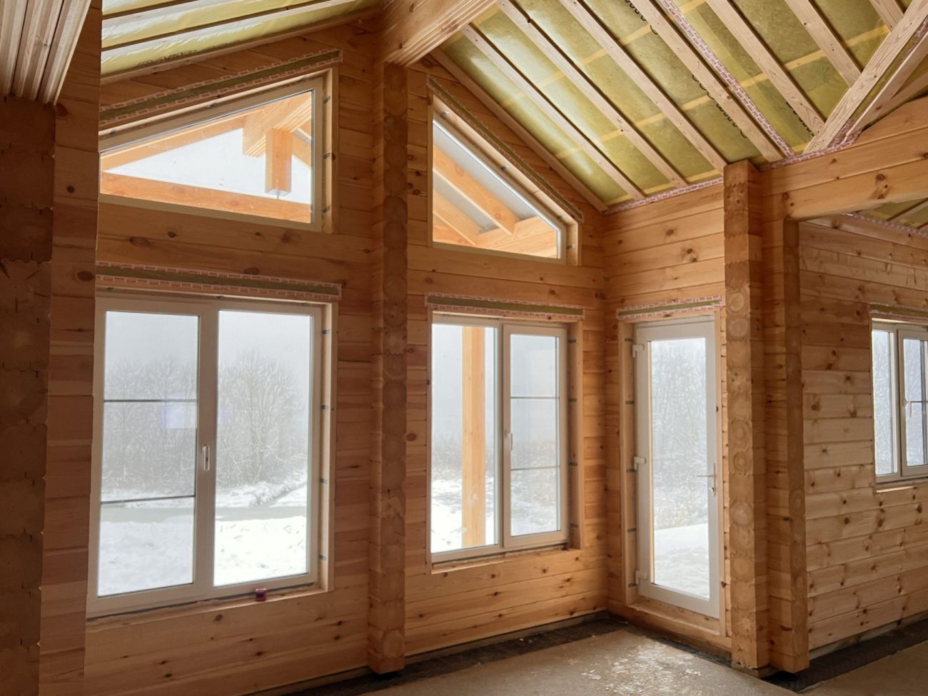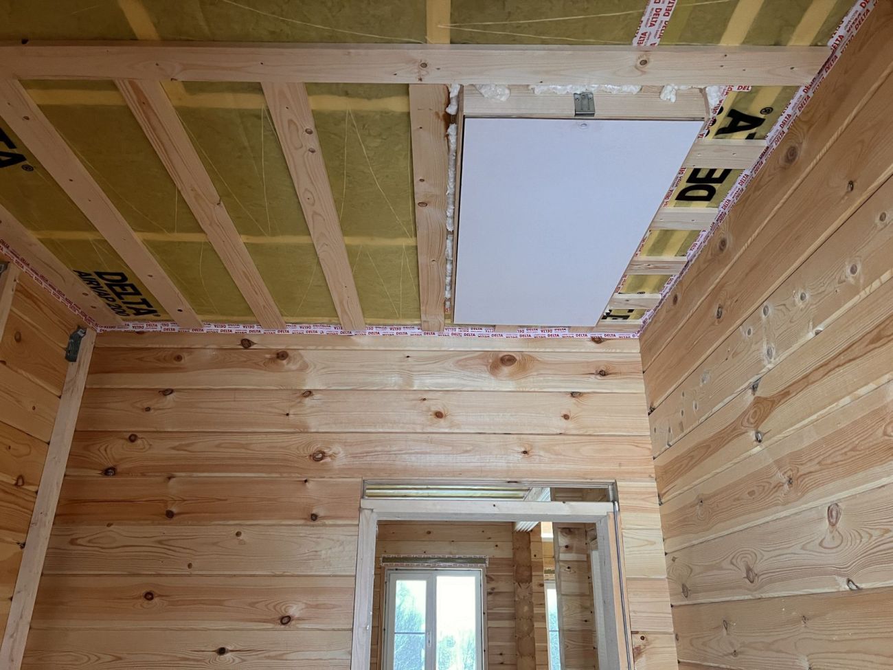 Внутри утеплили потолки по скатам и балкам каменной ватой Юматекс. Использовали качественную плёнку и скотч Delta — итоговая толщина утепления составила 250 мм.