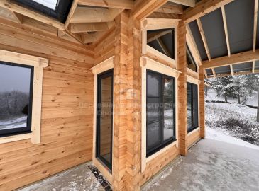 Сложные скошенные окна, выходящие на террасу, заказывали уже после выставления стропил, чтобы точно вывести угол наклона кровли.