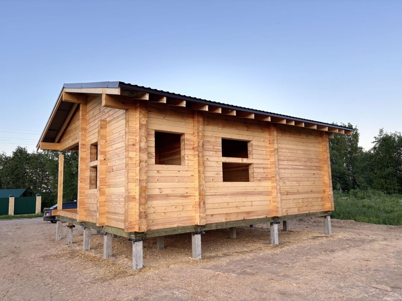Бригада Евгения Муравьёва успешно справилась с работой за 10 дней: по железобетонным сваям сделали обвязку из бруса 150х200мм, балки сечением 100х150 мм установили на опоры для бруса, стены собрали из профилированного бруса сечением 140х190 мм, крышу покрыли профлистом шоколадного цвета.