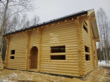 Завершили сборку дома 9,3х10,5 из оцилиндрованного бревна диаметром 240мм. Собирали вручную, венцы соединяли на березовые нагеля, в качестве межвенцового утеплителя использовали шелтер- синтетический материал на основе полиэфирных микроволокон.
