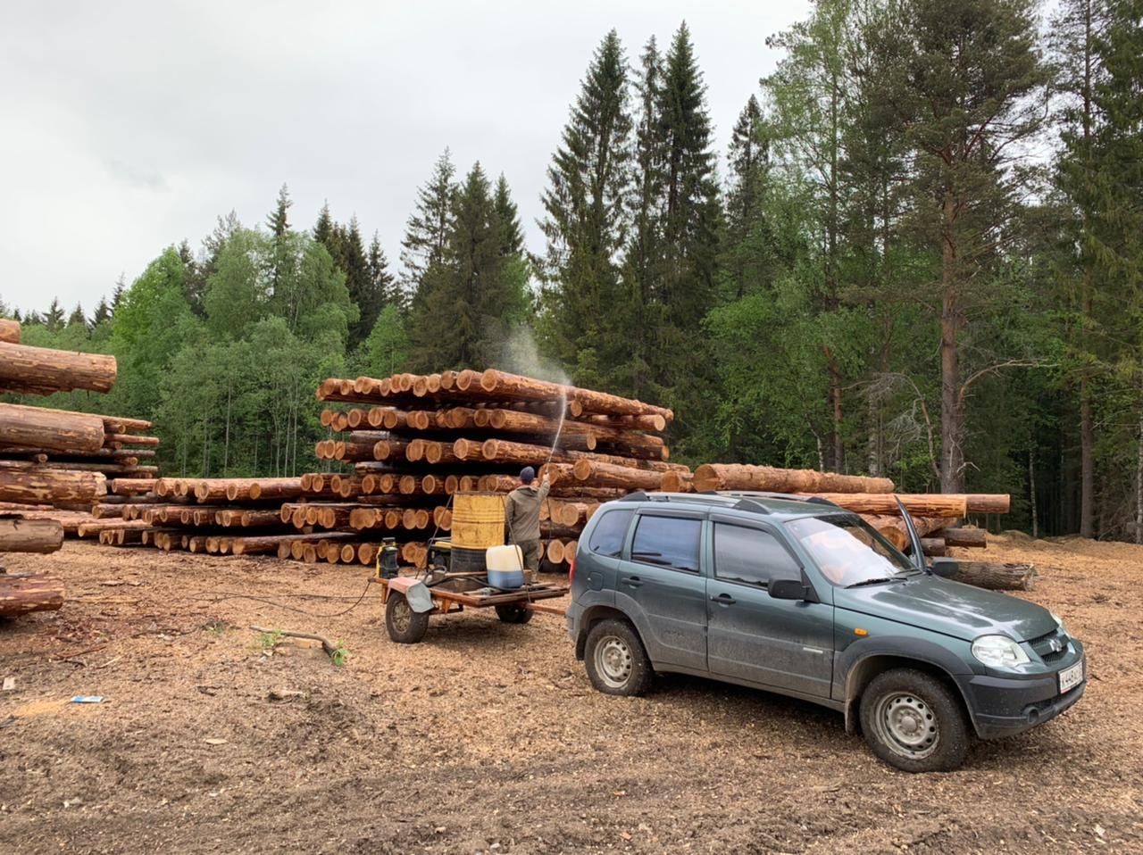Окоренное бревно мы сортируем по длине. Складываем в специальные клетки, где оно качественно продувается и равномерно просыхает. Чтобы сохранить заготовленный зимой лес до сентября, регулярно покрываем его антисептиком. Как? Крепим к «Ниве» прицеп. Ставим на него 200-литровую бочку с антисептиком. Ездим вокруг штабелей с лесом и через автомойку распыляем на него раствор. Данную процедуру проводим ежемесячно. Это помогает избежать гниения, защищает дерево от насекомых и мелких грызунов.