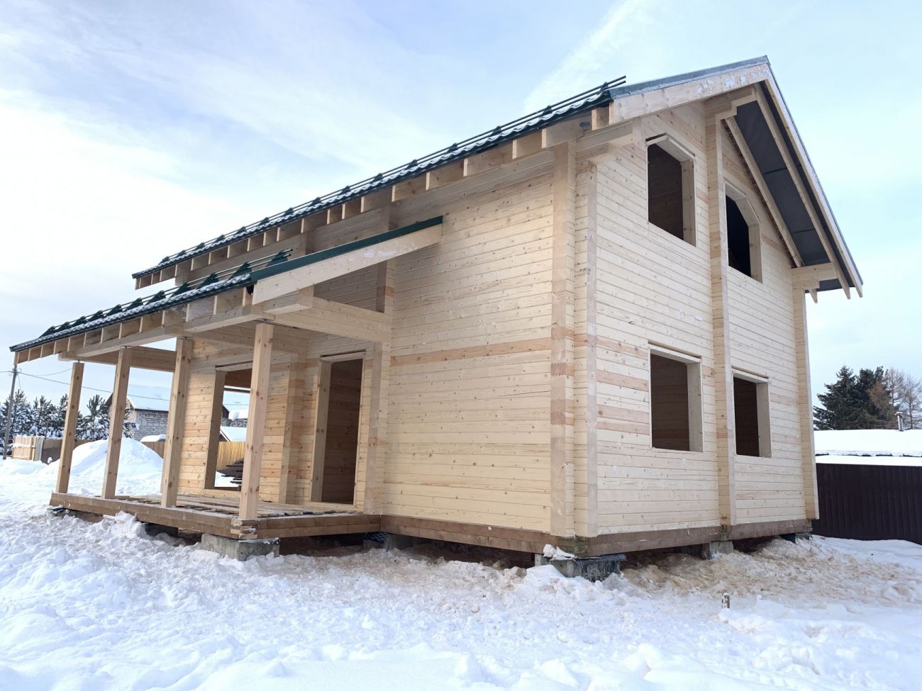 На окна и двери сразу поставили обсадные коробки. Крышу покрыли металлочерепицей GrandLine. Кровельные работы затруднял сильный ветер с близлежащего озера. Однако ни он, ни ударившие в декабре сильные морозы не помешали нам выполнить работу в срок. На всё про всё потребовался ровно месяц.