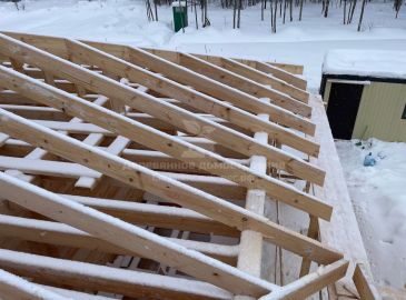 При монтаже каркаса кровли особое внимание уделили надежности конструкции: диагональные элементы выполнили из сдвоенных досок 50x200 мм, под каждое стропило установили подпорки, конек усилили укосами. Все элементы соединили на гвозди и дополнительно на металлические уголки.