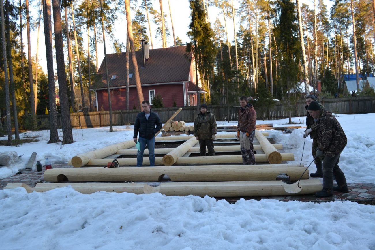 Сруб разгружен,начинаем собирать.Сруб будет собираться вручную без помощи спецтехники, так как отсутствует возможность подъезда к фундаменту.Так как масса машины со срубом составляет более 10 тонн, а на участке уложена тротуарная плитка,то было принято решение сруб собирать вручную