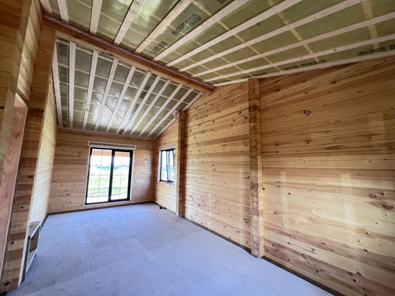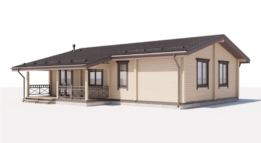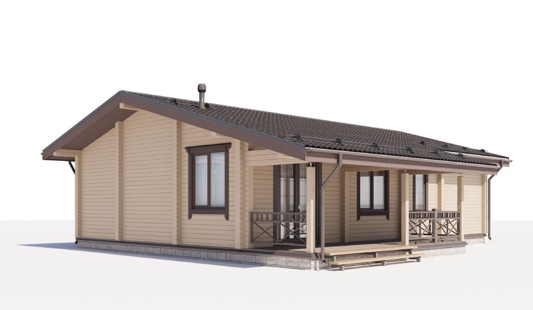 Дом построен в комплектации «теплый контур»: из профилированного бруса сечением 140×190 мм, потолки и скаты крыши утеплены ватой Umatex толщиной 250 мм, кровля покрыта металлочерепицей GrandLine, установлены окна и входная дверь, стены обработаны антисептиком, на крыше смонтированы вентиляционные выходы.