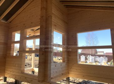 Сборка выпала на апрель. Снег уже растаял, но земля ещё не просохла. Поэтому главной нашей задачей было не ударить в грязь лицом: в прямом и переносном смысле. Ставили сруб мы очень аккуратно: брус носили бережно, чтобы не уронить и не запачкать ни одной детали. Крышу сразу покрыли металлочерепицей цвета «Шоколад».