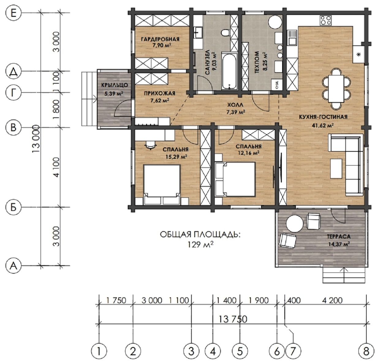 Дом строим из профилированного бруса камерной сушки 140 х 190 мм — материал стабильный, тёплый и отлично подходящий для круглогодичного проживания.