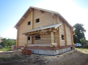 Сруб из рубленого бревна диаметром 28-30 см. В доме есть цокольный этаж, выполненный из блоков и закрытый плитами перекрытий, мы надстраивали первый и мансардный этажи. Проект разрабатывался архитектором, внешний вид согласовывался с администрацией города, так как город следит за сохранением культурного наследия и проект должен был соответствовать архитектурным решениям.
