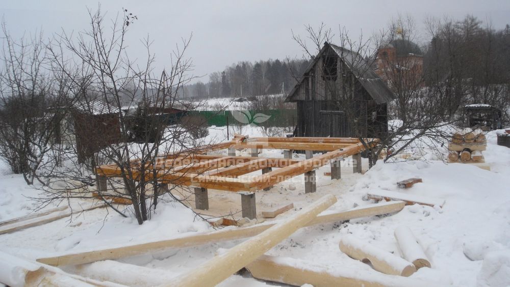 3)Изготовлением и сборкой сруба занималась бригада Евгения Муравьева. Фундамент бани расположен в саду, где растут яблони очень редкого вида. К сожалению, при согласии заказчика, одну яблоню пришлось спилить, чтобы смонтировать сруб и установить крышу.
