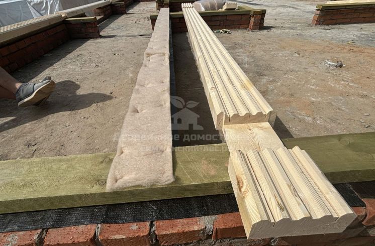 Баня включает просторную комнату отдыха и одну спальню, что обеспечит комфортное пребывание за городом. Фундамент был выполнен в три этапа: сначала была залита лента, затем внутри ленты сделана бетонная стяжка, и уже поверх стяжки выполнена кладка из кирпича в три ряда. Заказчик хотел, чтобы чистовой пол с плиткой идеально подходил под основание бруса, поэтому местные строители несколько раз переделывали кладку, чтобы обеспечить необходимый отступ.