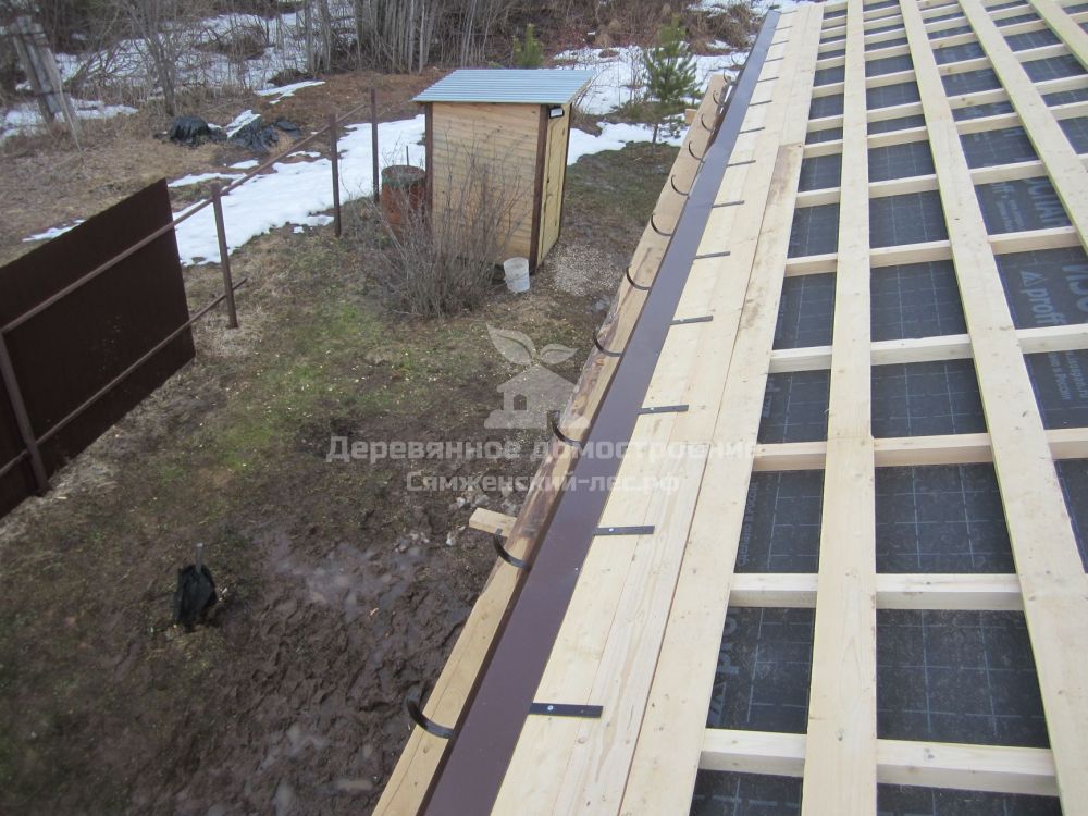 Сборка выпала на апрель. Снег уже растаял, но земля ещё не просохла. Поэтому главной нашей задачей было не ударить в грязь лицом: в прямом и переносном смысле. Ставили сруб мы очень аккуратно: брус носили бережно, чтобы не уронить и не запачкать ни одной детали. Крышу сразу покрыли металлочерепицей цвета «Шоколад».