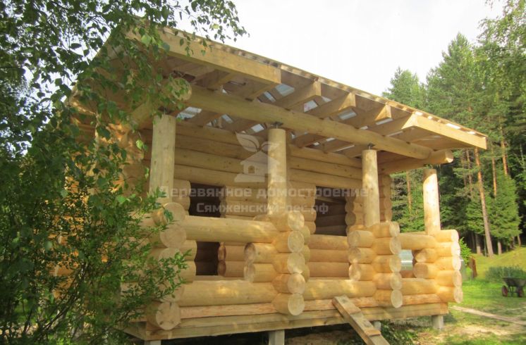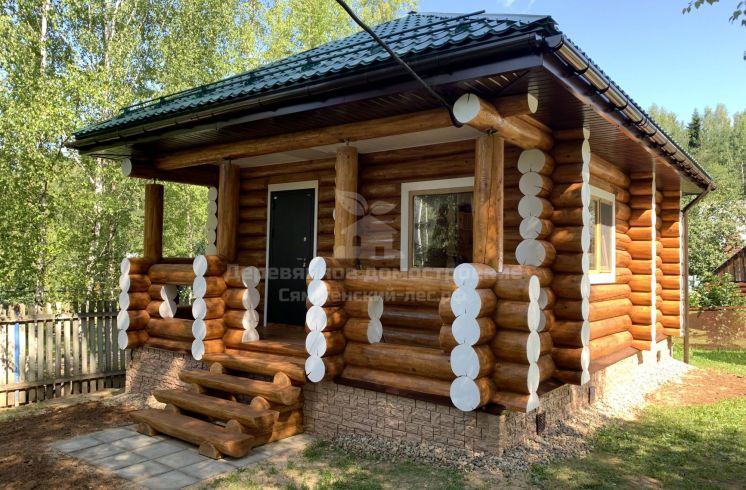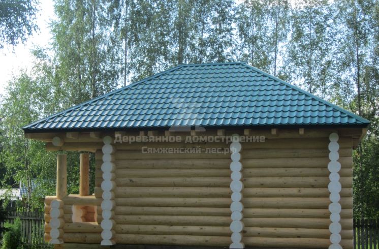 Новую баньку сямженцы поставили в углу хозяйского участка, там, где берёзы отделяют его от дороги. Крышу покрыли металлочерепицей GrandLine Satin цвета зелёный мох. Пока ждали её изготовления, Юрий занялся отделочными работами: отшлифовал торцы баньки и покрыл их белой плёнкообразующей краской, чтобы дерево сохло равномерно.