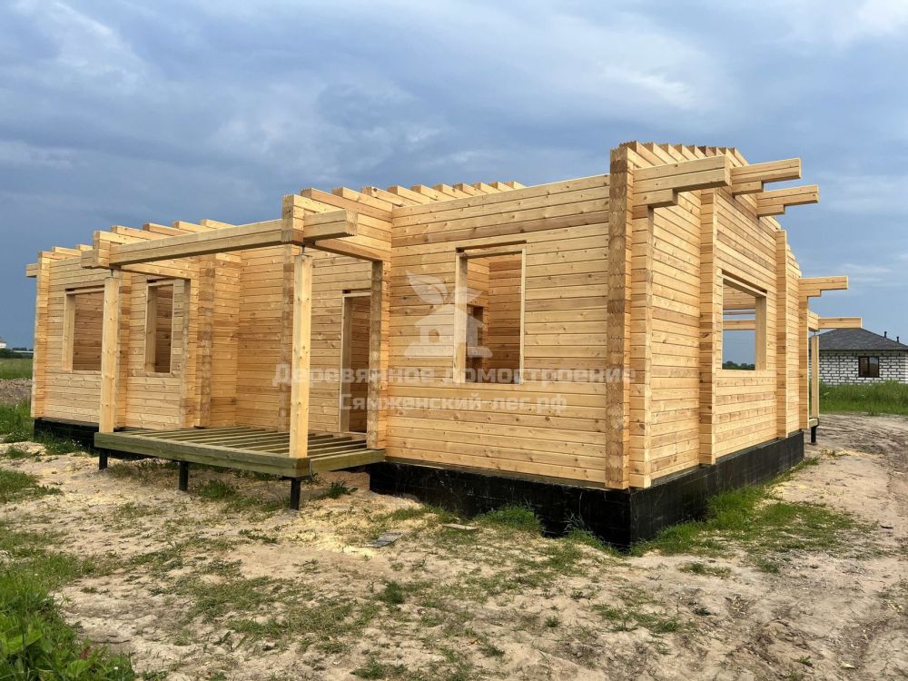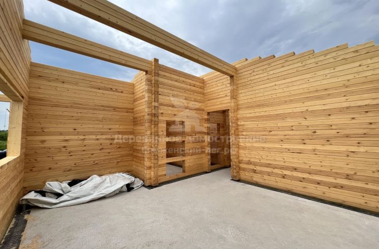 Стены собрали из профилированного бруса камерной сушки собственного производства, сечение бруса 140х190мм, на окна и входную дверь установили обсадные коробки. Дальнейшие работы заказчик Сергей будет выполнять своими силами.