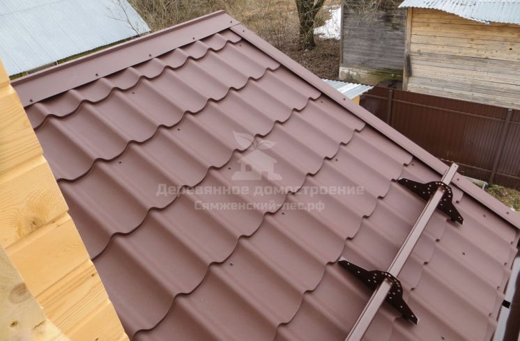 Покрыли крышу матовой металлочерепицей GrandLine PurLite Matt, цвет шоколад. Карнизные свесы подшили белыми металлическими софитами. На окна и двери установили обсадные коробки.