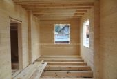 В первую очередь сделали обвязку из бруса 200х200мм по существующему фундаменту и новым сваям, далее в течение месяца бригада Артема Бешеля трудилась над сборкой домокомплекта. Работу осложняли стесненные условия на участке. Материал пришлось завозить 2-мя частями, так как не хватило места на участке для разгрузки материала.