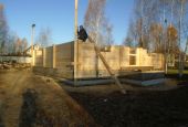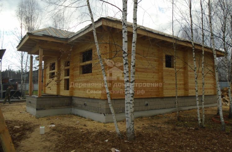 В июле был залит ленточный фундамент на высоту 30см, а дальше выложен цоколь из бетонных блоков на высоту 60см. Домокомплект изготовили по проекту Любовь из нашего каталога, 7 октября доставили на участок, а уже 23 октября завершили сборку.