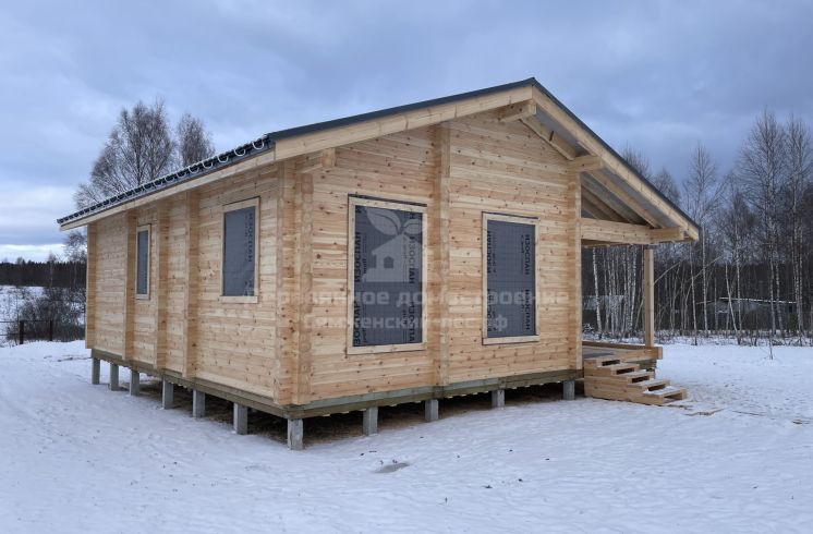 Окна и дверь заказчики уже купили у местной оконной компании, через пару недель их вставят и будет дом в комплектации “теплый контур”.Чтобы сейчас внутрь дома через проемы не попадал снег и дождь временно закрыли проемы пленкой.Бригада Дениса Будрина выполнила все работы за месяц!Хорошо, что нам повезло с погодой: пока собирали дом и монтировали крышу, не было дождей, иначе сразу утеплить внутри пол и потолок мы бы вряд ли смогли, потому что дерево бы намокло. Такая в этом году зима...
