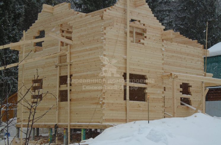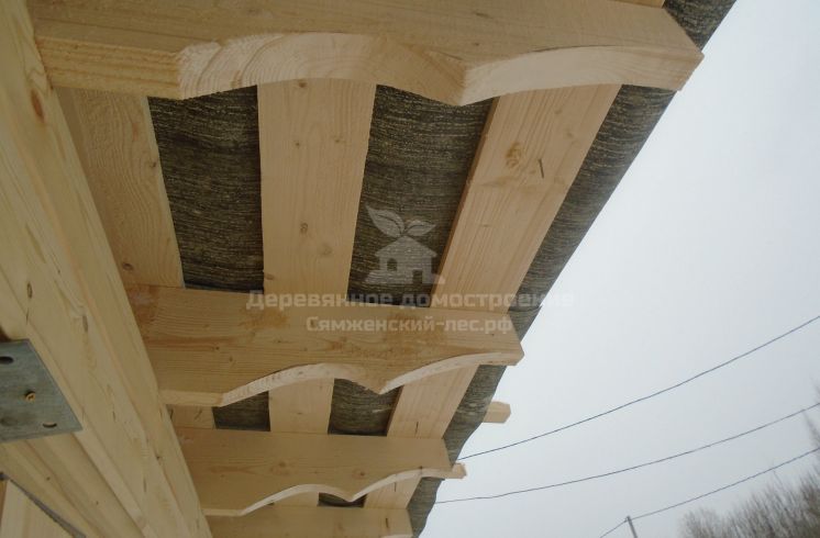 Материал стен - профилированный брус камерной сушки 140х140 мм. Сборку дома мы доверили бригаде Артема Бешеля. 10 февраля 2019 года мы изготовили домокомплект, доставили на участок, 4 марта бригада завершила сборку. Наши Заказчики попросили нас сделать фигурный вырез в карнизной части стропил - все остались довольны результатом!