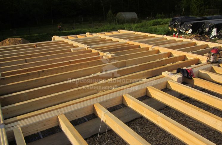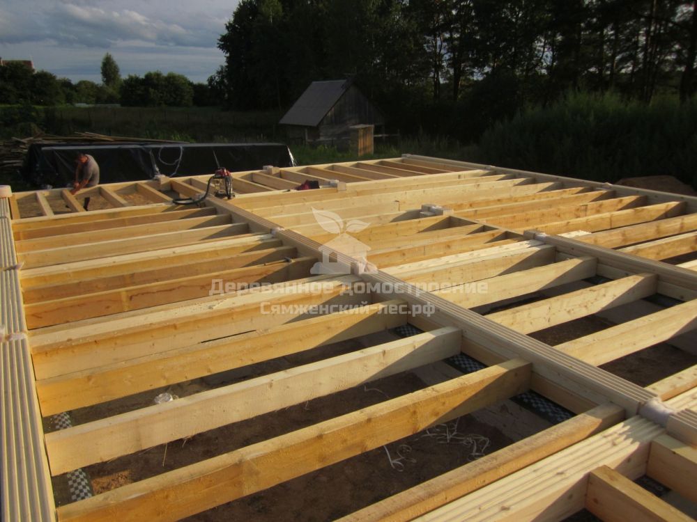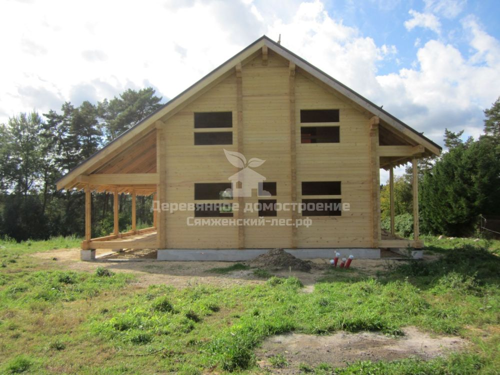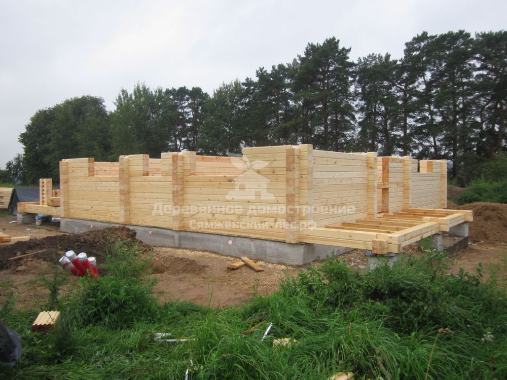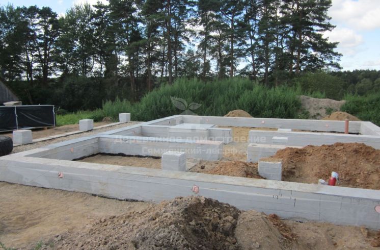 Силами местного подрядчика заложили фундамент. Да вот незадача: тот допустил ошибку: один столб не попал в переруб сруба – при возведении дома мы заменили его временной опорой из бруса. Не беда! Позже хозяева просто зальют ещё один столб в нужном им месте.