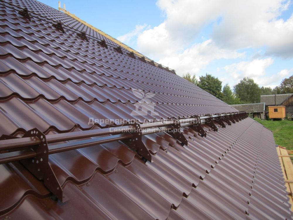 Кровлю покрыли металлочерепицей «ГрандЛайн» цвета «шоколад». Поскольку у крыши длинные скаты, установили 2 ряда снегозадержателей.