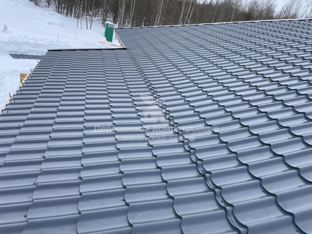 Крышу покрыли металлочерепицей GrandLine Satin, цвет “мокрый асфальт”. Каждый лист подрезали вручную с помощью специальной насадки на шуруповерт “сверчок”. Подрезка выполняется небыстро, зато поверхность металлочерепицы остается невредимой.