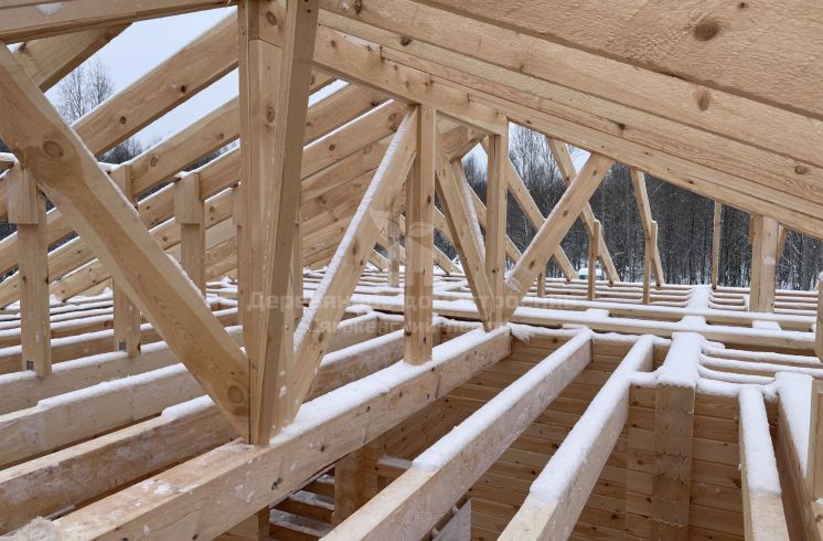 При монтаже каркаса кровли особое внимание уделили надежности конструкции: диагональные элементы выполнили из сдвоенных досок 50x200 мм, под каждое стропило установили подпорки, конек усилили укосами. Все элементы соединили на гвозди и дополнительно на металлические уголки.
