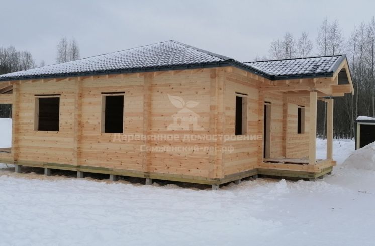 В Череповце завершили строительство одноэтажного дома 12х13 из профилированного бруса. Сборка стен прошла довольно быстро, а вот установка крыши заняла в 2 раза больше времени. Сложность заключалась в том, что крыша состоит сразу из трех типов: основная форма - вальмовая, односкатная над террасой и двускатная над крыльцом. Общая площадь всех трех крыш составляет 192 квадратных метра.