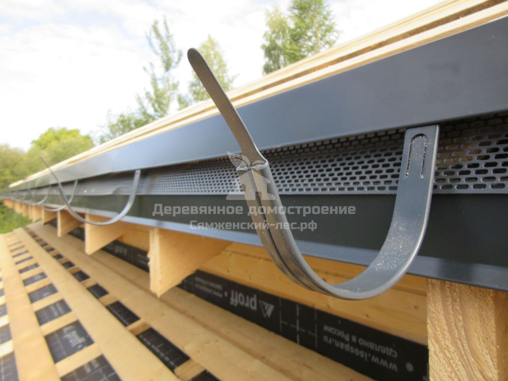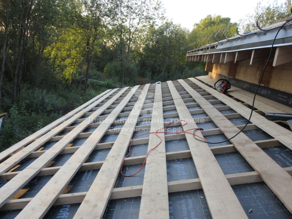 Для нас этот дом стал юбилейным. 30-й успешно завершенный объект в этом году. Стандартно крышу покрыли металлочерепицей GrandLine, на окна и двери установили обсадные коробки, стены обработали антисептиком.