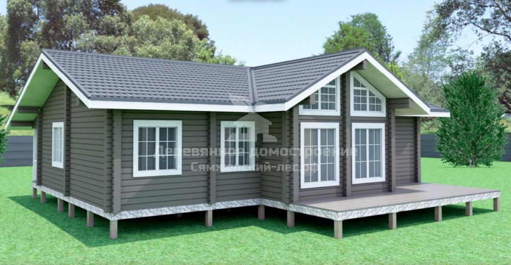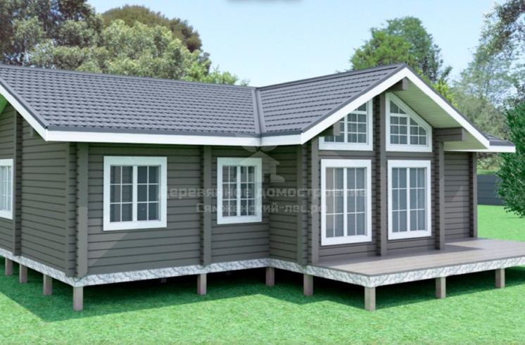 Проект одноэтажного дома адаптирован под особенности участка и образ жизни семьи. Основной акцент сделан на раскрытие вида: в доме предусмотрено большое остекление и открытая терраса, ориентированная в сторону реки.