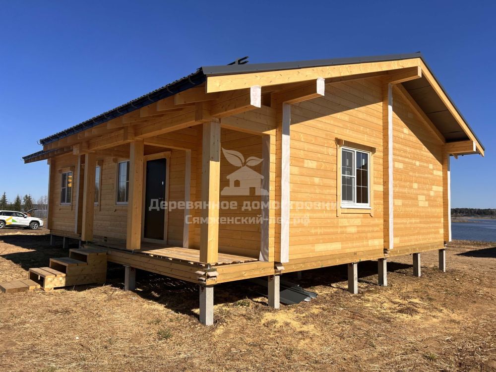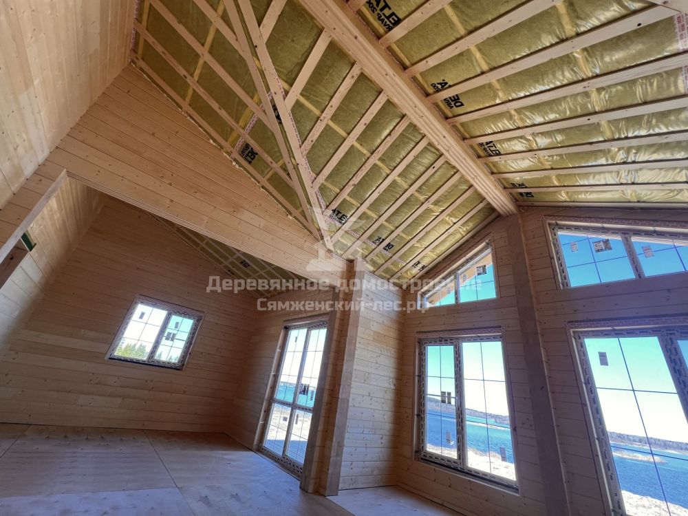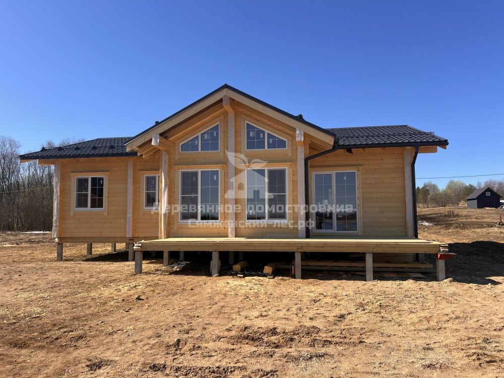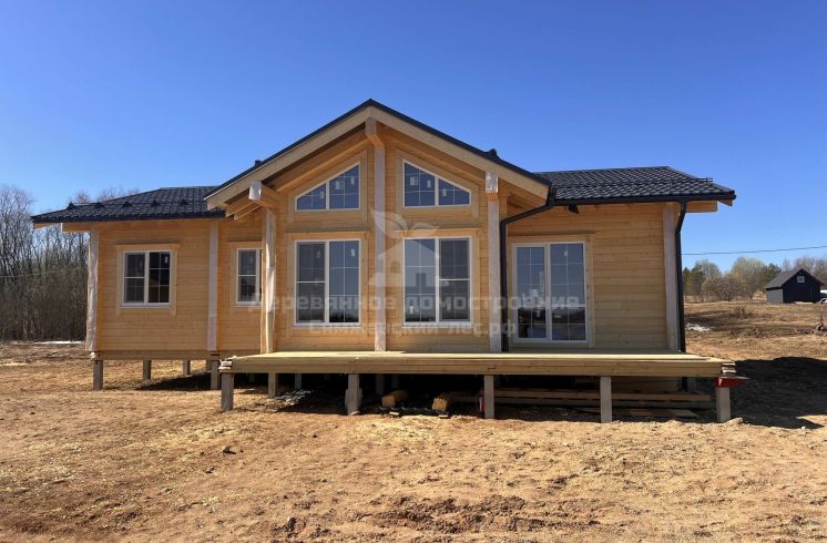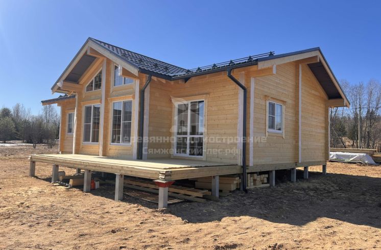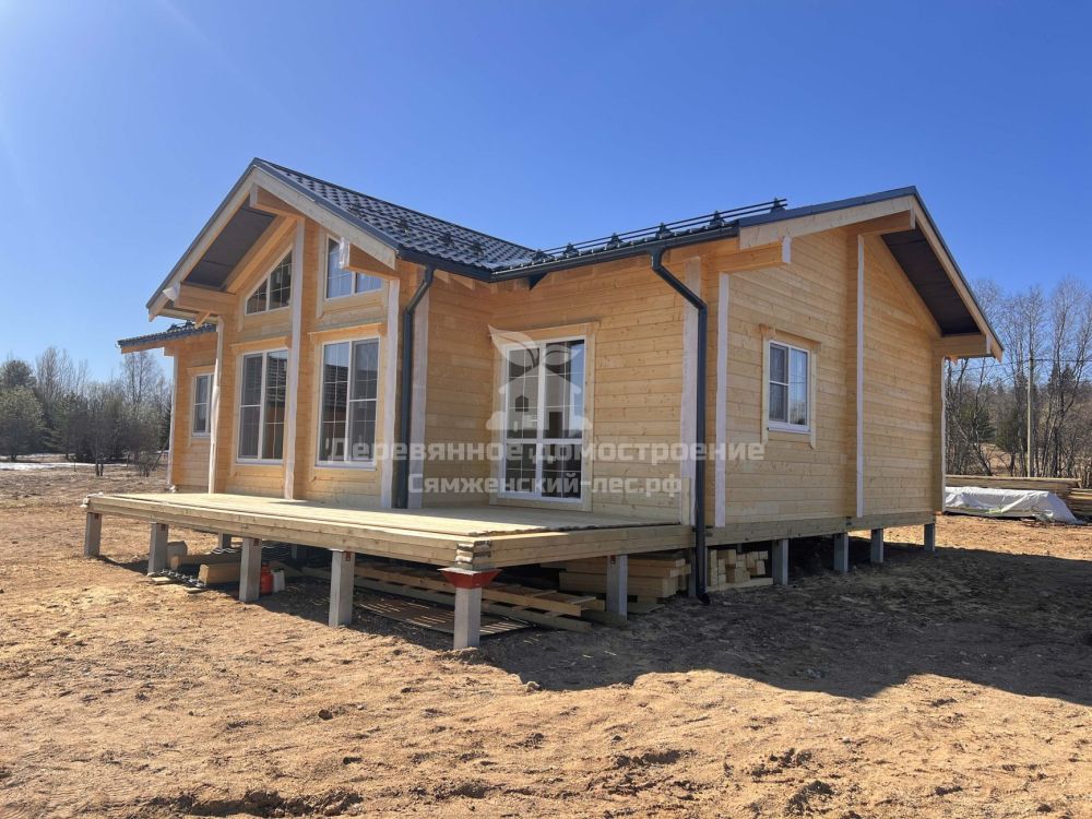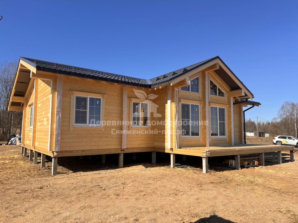 Фундамент выполнен на железобетонных сваях. Сборка дома велась в сложных погодных условиях, включая сильный ветер, но все работы были завершены в течение 2 месяцев.