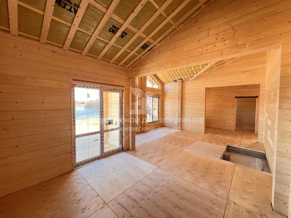 Современный дом из клееного бруса с панорамным остеклением и террасой. Построен на возвышенном участке в деревне Кабачино с видом на реку.