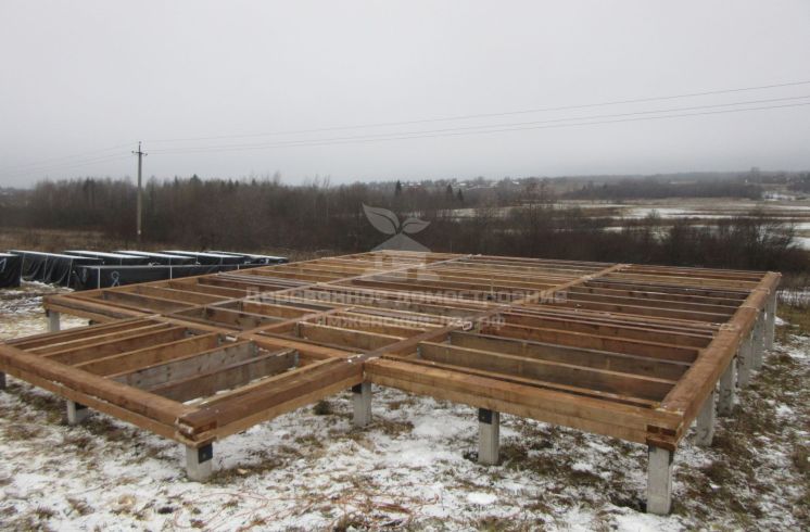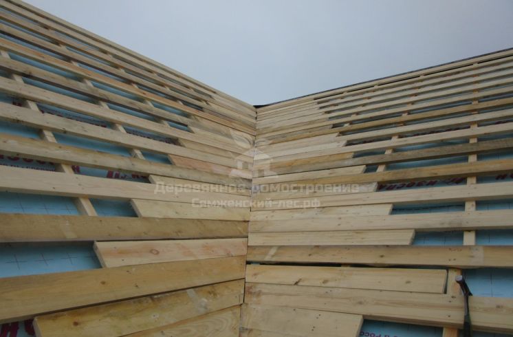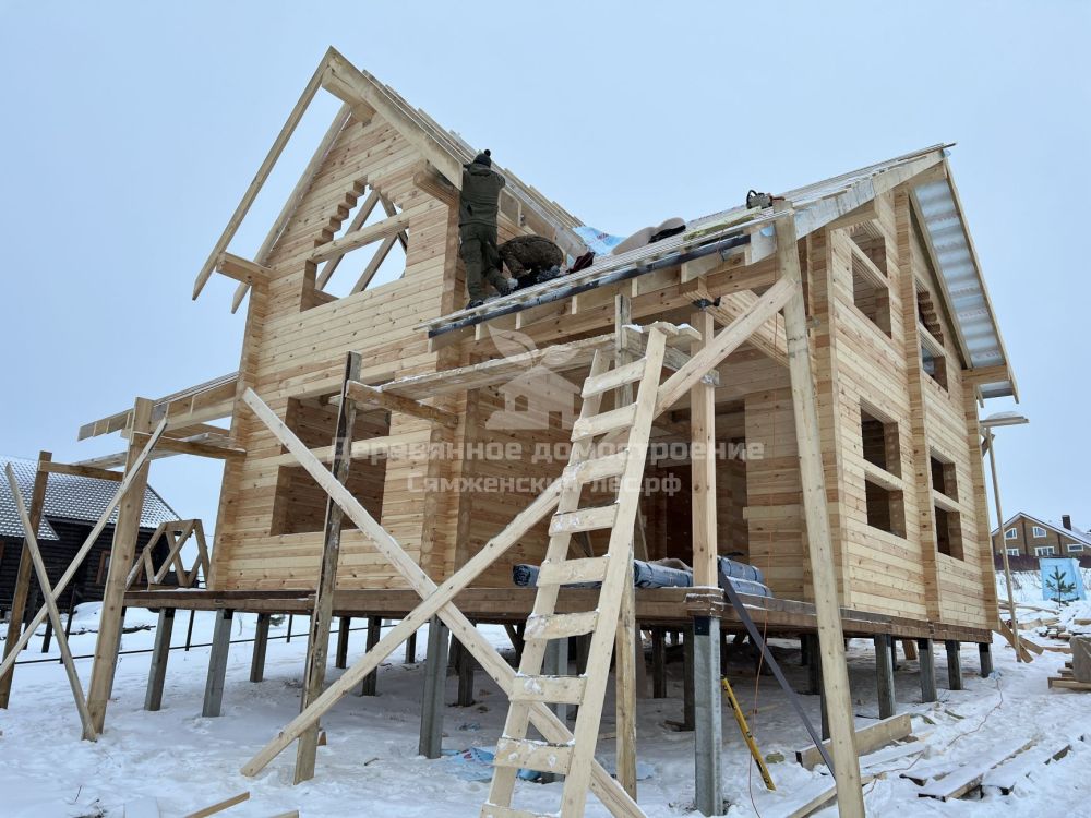 Стройка немного затянулась из-за непогоды. Чтобы не рисковать, решили сейчас мягкую черепицу не монтировать, а оставить дом до весны с подкладочным ковром.