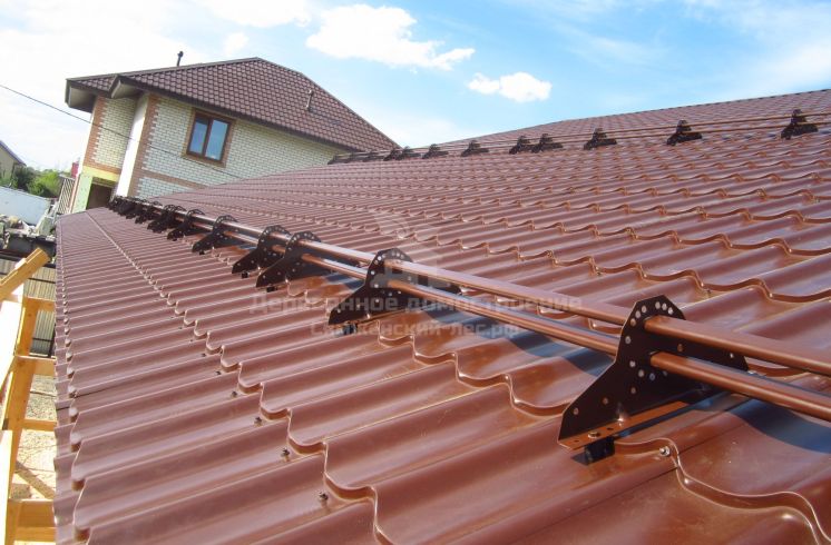 Кровлю покрыли металлочерепицей GrandLine Satin цвета «шоколад». Крыша двускатная: один скат – 7 метров длиной, второй – 9. Для надёжной защиты от снега установили 2 ряда снегозадержателей.