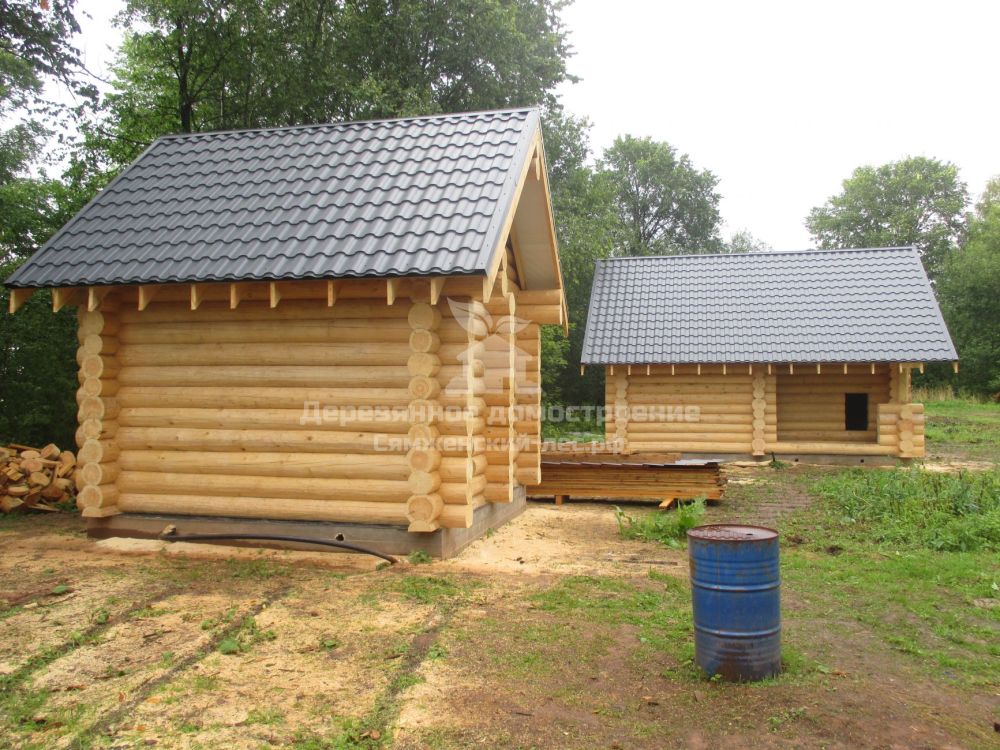 К сборке срубов приступили в августе. Дом для Марины и Дмитрия мы своё время возвели из бревна  диаметром 30см. Чтобы не нарушать единство архитектурного ансамбля, баню и хозпостройку заказчики попросили выполнить из такого же крупного бревна.
