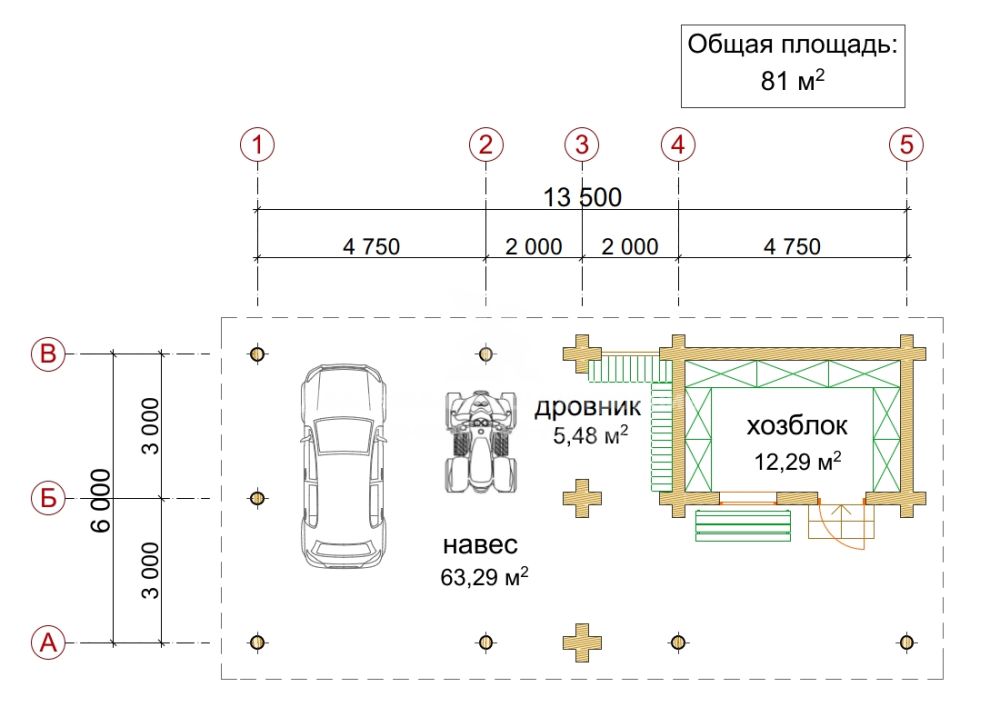 В качестве фундамента заказчик залил бетонные сваи. Под перекрестия из брёвен залил массивные тумбы для обеспечения устойчивости конструкции. Чтобы уменьшить усадку сруба и повысить его прочность, каждый венец прокрутили на пружинный узел Tedwood. Для надёжности навеса ещё потребуются дополнительные укосины на столбы, которые заказчик смонтирует в ближайшее время из кованого металла.