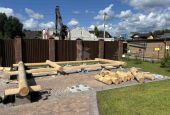 Навес собрали за 10 дней, работали максимально аккуратно, чтобы не повредить брусчатку и забор. Крышу покрыли такой же металлочерепицей Weckman Marette финского производства, как и на доме.