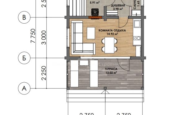 Интерьер брусовой бани завершает парная (5,3 м²) и помывочная (5,3 м²). Потолок в них сделан по балкам перекрытия для уменьшения отапливаемого объема и создания уюта. К передней части постройки примыкает большая крытая веранда (14,3 м²) для отдыха на свежем воздухе.