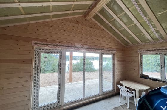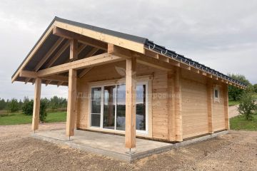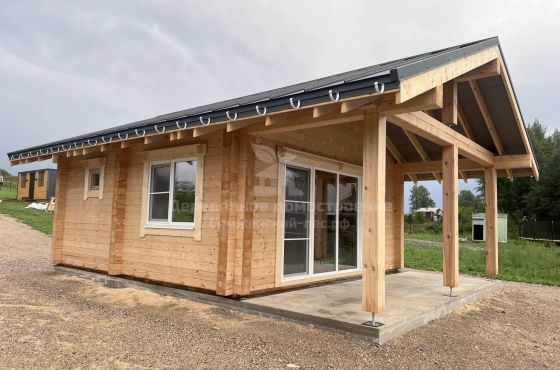Деревянная баня «Лесная» органично соединяет в себе черты традиционного русского стиля и лофт. В просторном главном помещении (площадью 13,5 м²) установлено витражное остекление. Потолок выполнен по скатам кровли высотой в верхней точке 3,7 метра.