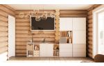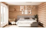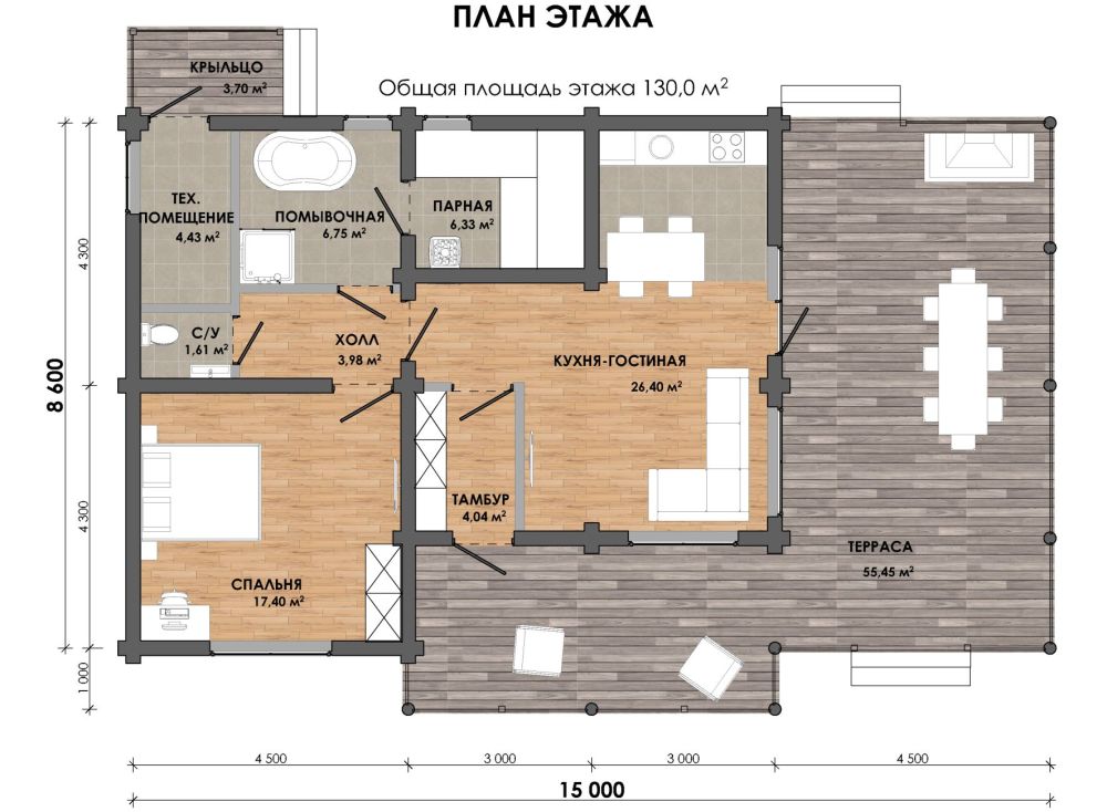 Дом-баня из бревна площадью в 130 м2 состоит из жилой зоны и пространства для отдыха. Первая представлена кухней-гостиной (26,4 м2) и спальней (17,4 м2). Огромная терраса (55,4 м2) оборудована крышей, чтобы наслаждаться свежим воздухом и ароматом хвои в любую погоду. Потолки в общей зоне сделаны по скату кровли, что в сочетании с панорамным остеклением делает помещение светлым и просторным.