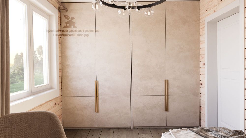 Гостей встречает крытое крыльцо (7,41 м²), которое при желании можно застеклить, переоборудовав в дополнительное помещение. Внутри расположены ванная (6,79 м²), кухня (10,71 м²), гостиная (25,84 м²) и 2 спальни, одинаковые по площади (по 10,78 м² каждая). Отдельное преимущество планировки – наличие выделенного гардероба (3,65 м²).
