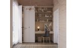Первый этаж брусового коттеджа, помимо гостиной (19,06 м²) и полуоткрытой кухни (7,71 м²), состоит из кабинета/гостевой (12,28 м²), ванной (7,68 м²) и огромного холла (15,33 м²) у лестницы. В мансарде нашлось место для трех спален по 13-15 м², общего санузла и отдельной гардеробной. Особого упоминания стоит холл у лестницы (12,10 м²), который можно использовать как дополнительную гостиную.
