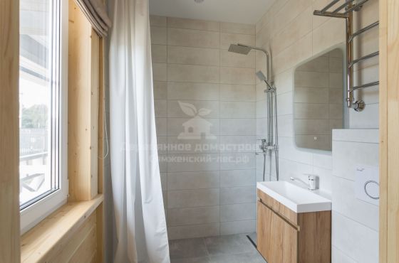 Владельцы дома из бревна приятно удивятся наличию собственного санузла и гардеробной в главной спальне. Прихожая, котельная, прачечная и общая ванная завершают внутреннюю планировку.