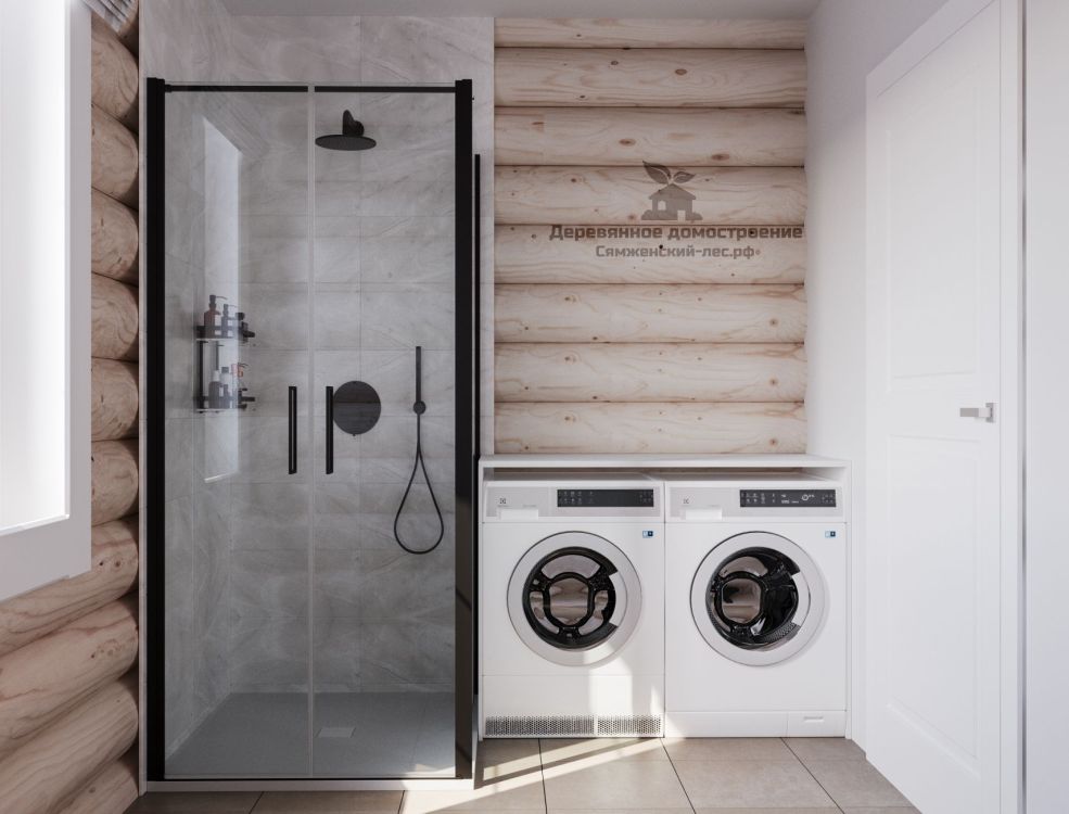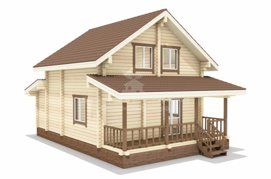 На первом этаже бревенчатого дома есть кухня-гостиная (18,8 м2), ванная (5,17 м2) и жилая комната (9,3 м2), которую можно превратить в кабинет, гостевую спальню или детскую. Кладовая у лестницы и техническое помещение дополняют интерьер. Мансарда коттеджа из бревна разделена на две спальни (по 13,9 м2), санузел (4,47 м2) и холл (7,34 м2).